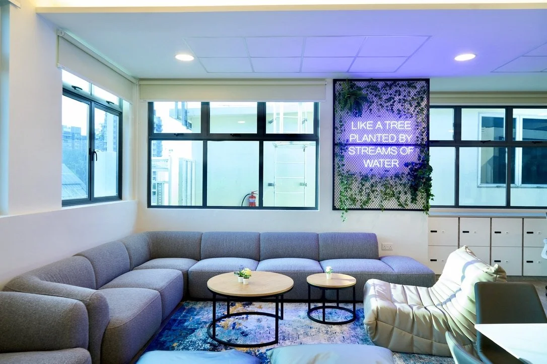 This staff lounge, situated within a local church, has been redesigned and furnished to create a cozy yet conducive environment for work, meetings, and gatherings.